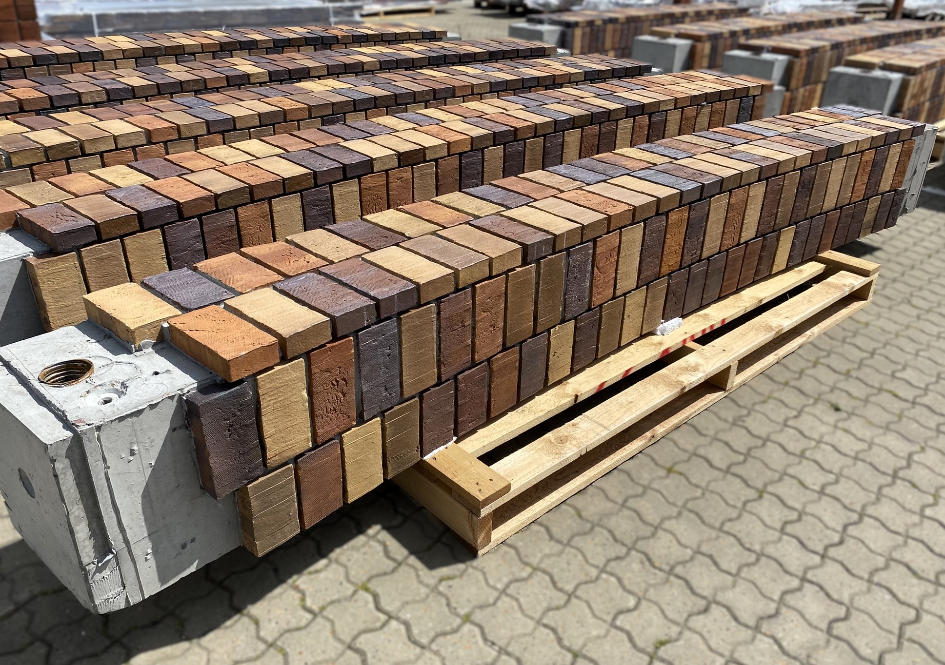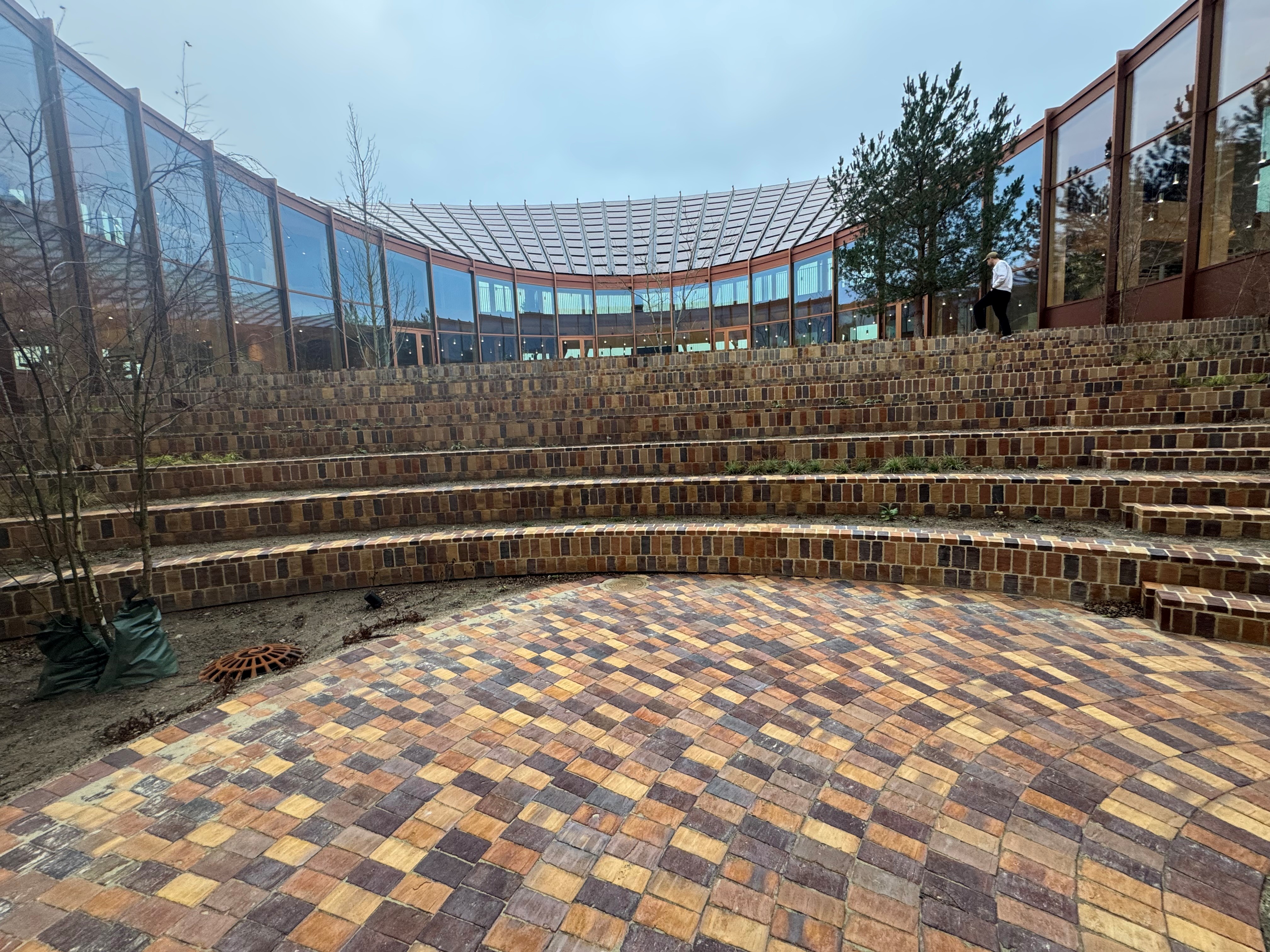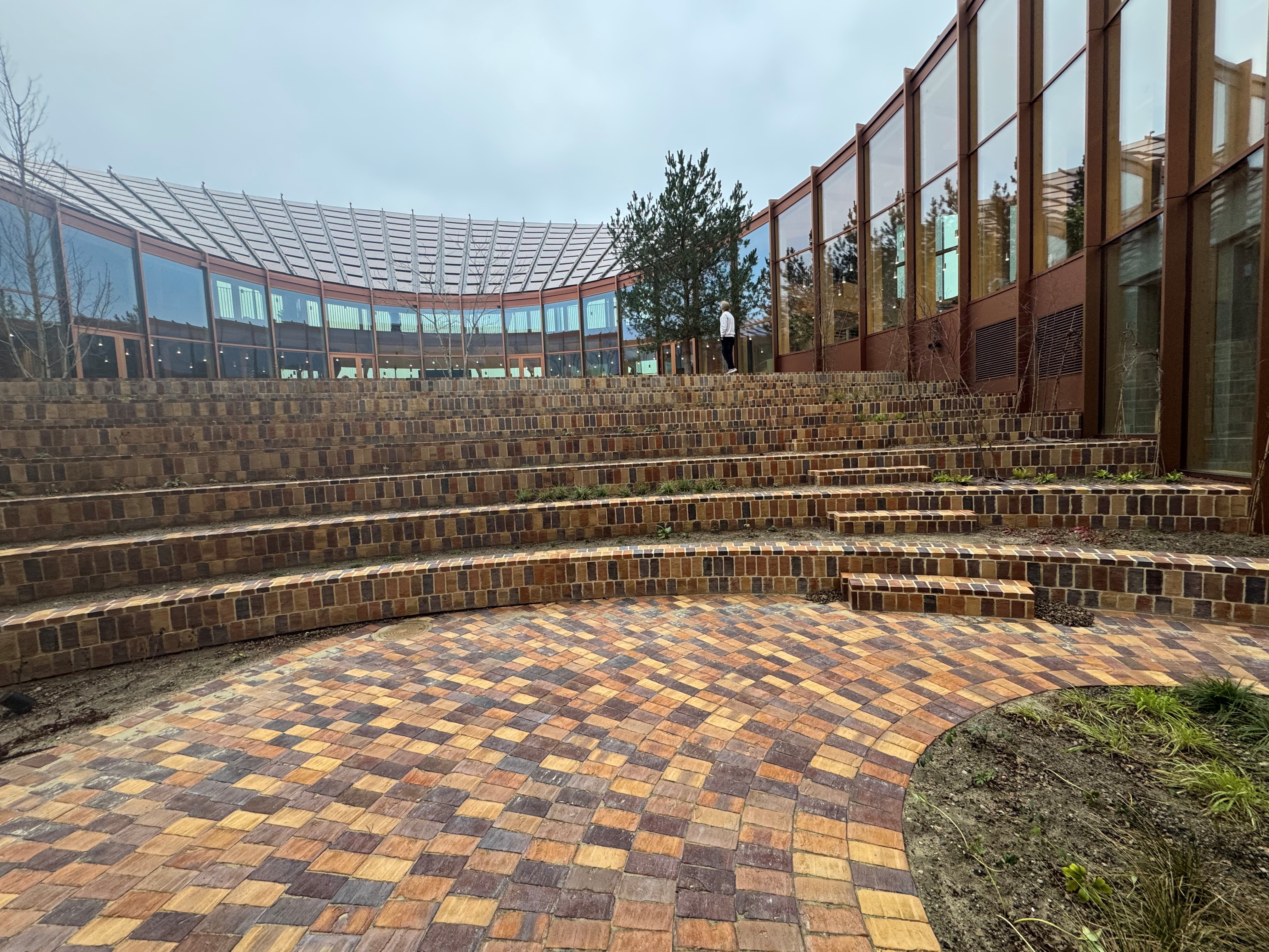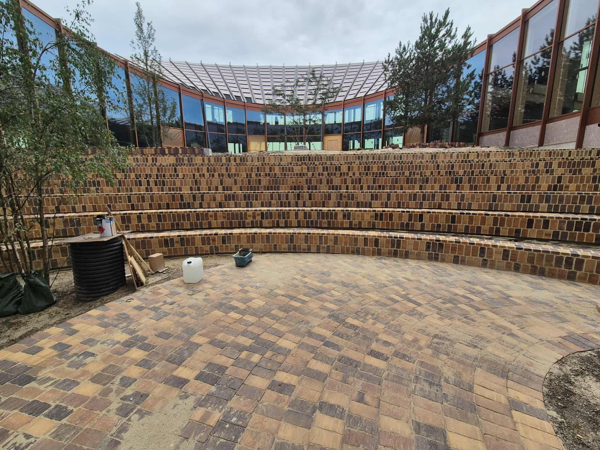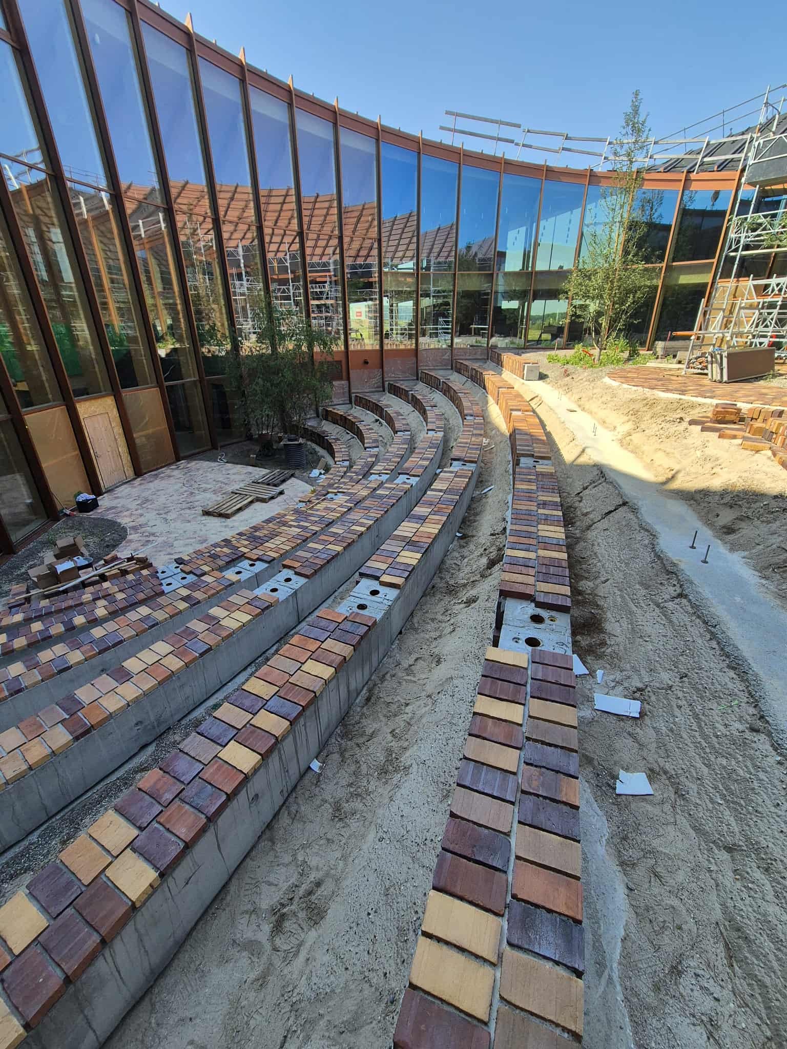 Midt i den cirkulære bygning, bliver der en ”gårdhave”, som kommer til at fungere som projektets grønne hjerte, og til denne gårdhave, har vi som underleverandør til CJ Group, leveret store beton- teglelementer, som en slags amfitrappe i byggeriets centrum.